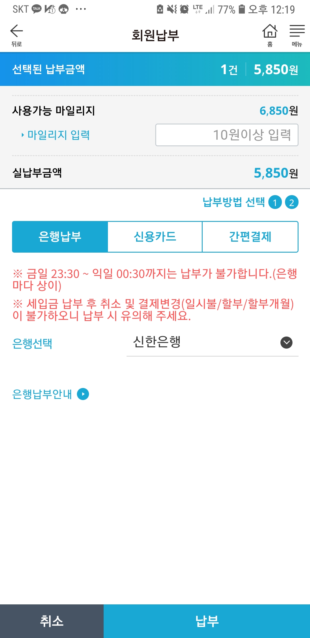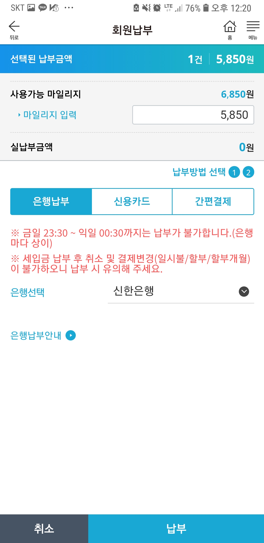 마일리지 입력칸에 내야할 세금 액수 만큼 직접 입력한다.
