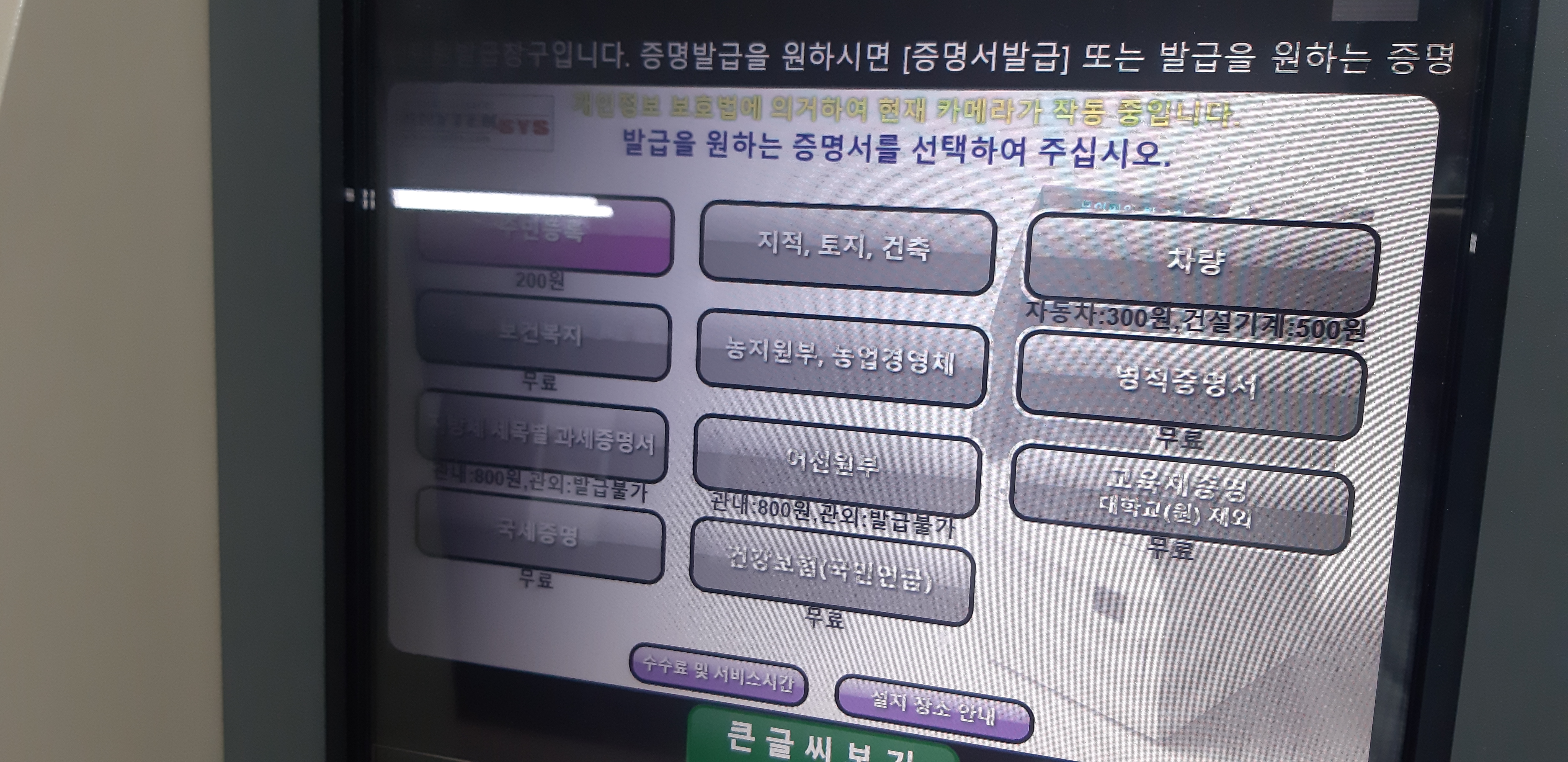 단 역사등에 있는 발급기는 유료이다. 등본출력을 200원 받는다. 가까워서 동사무소 갈 시간이 안되는 사람은 200내고 하고 동사무소 가면 무료이니 선택하녕 될듯.