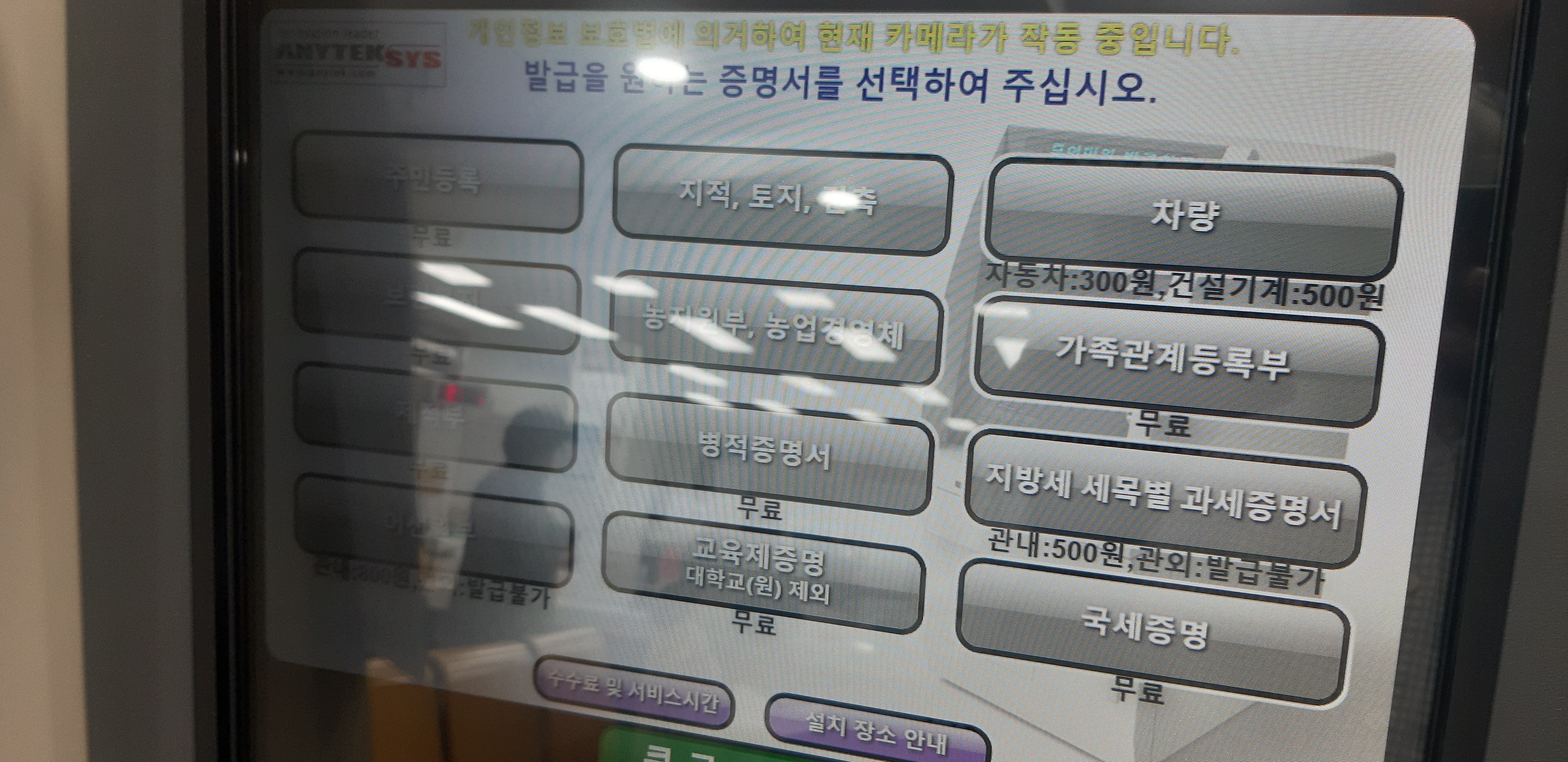 동사무소 가면 주민등록 등본은 기계에서 무료로 발급이 가능 하다.