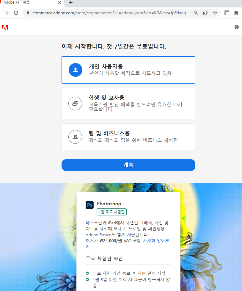 그래서 포토샵 무료체험 으로 검색해보니 7일 무료로 쓸 수 있는게 아도비 공식 사이트에 있었다.