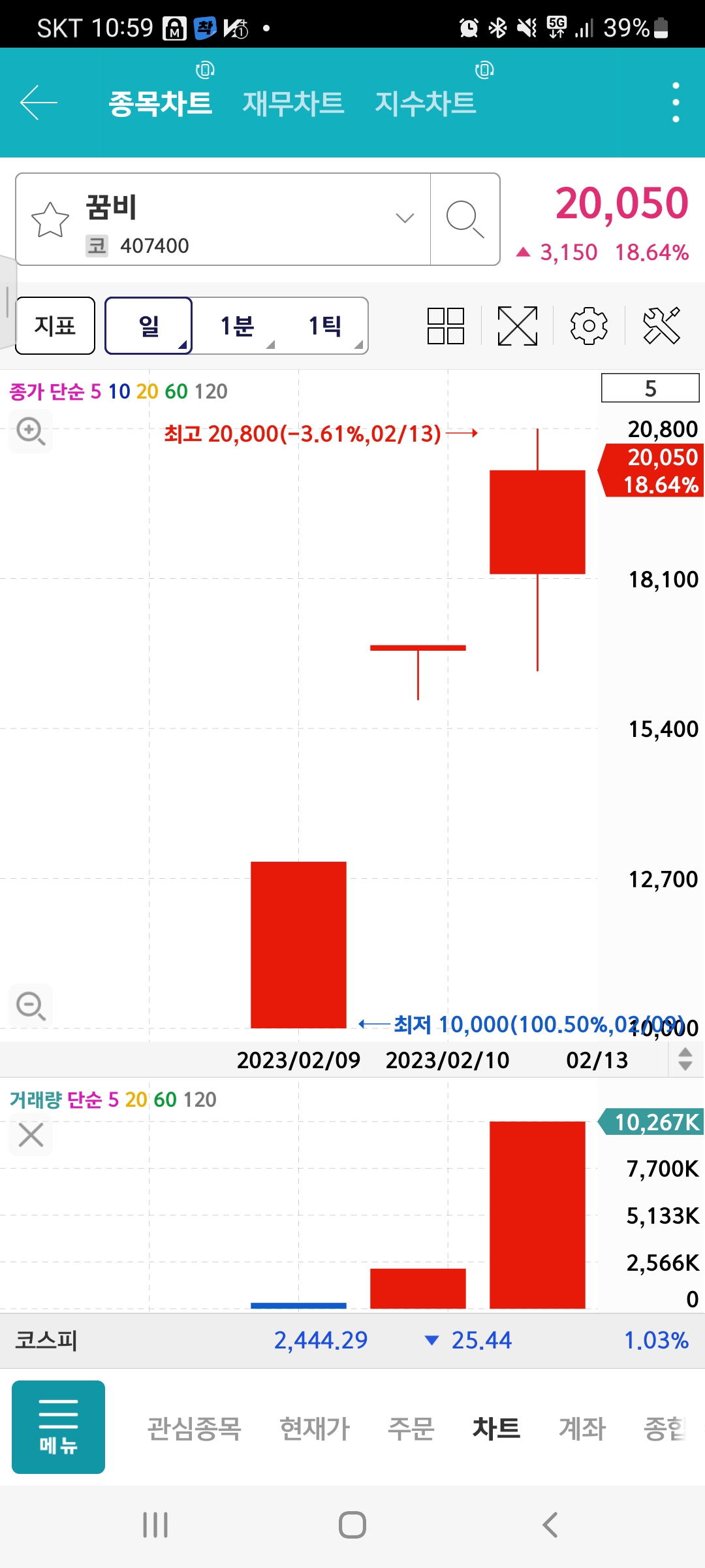 이번에 스튜디오 미르도 첫날에 따상에 안착했다. 둘째날이 되서 차트를 보니 따상상까지는 못가고 20% 정도 상승에서 왔다갔다 하였다.